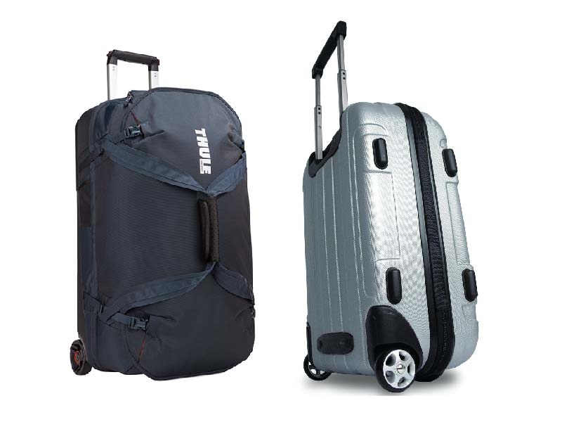 กระเป๋าเดินทางแบบ 2 ล้อเป็นกระเป๋าเดินทางล้อลากที่เมื่อจะลากต้องเอียงให้มุมกระเป๋าเดินทางเฉียงเล็กน้อยก่อนจึงค่อยลากได้ เมื่อลากกระเป๋าเดินทางพื้นที่คับแคบอาจต้องมีการยกหรือหาเหลี่ยมมุมเพื่อช่วยให้ลากกระเป๋าเดินทางได้แต่ก็มีข้อดีตรงที่เมื่อวางกระเป๋าเดินทางไว้เฉย ๆ กระเป๋าเดินทางจะอยู่นิ่งไม่ไหลไปไหนได้เองส่วนใหญ่กระเป๋าเดินทางแบบ 2 ล้อมักมีราคาประหยัดกว่าแบบอื่น