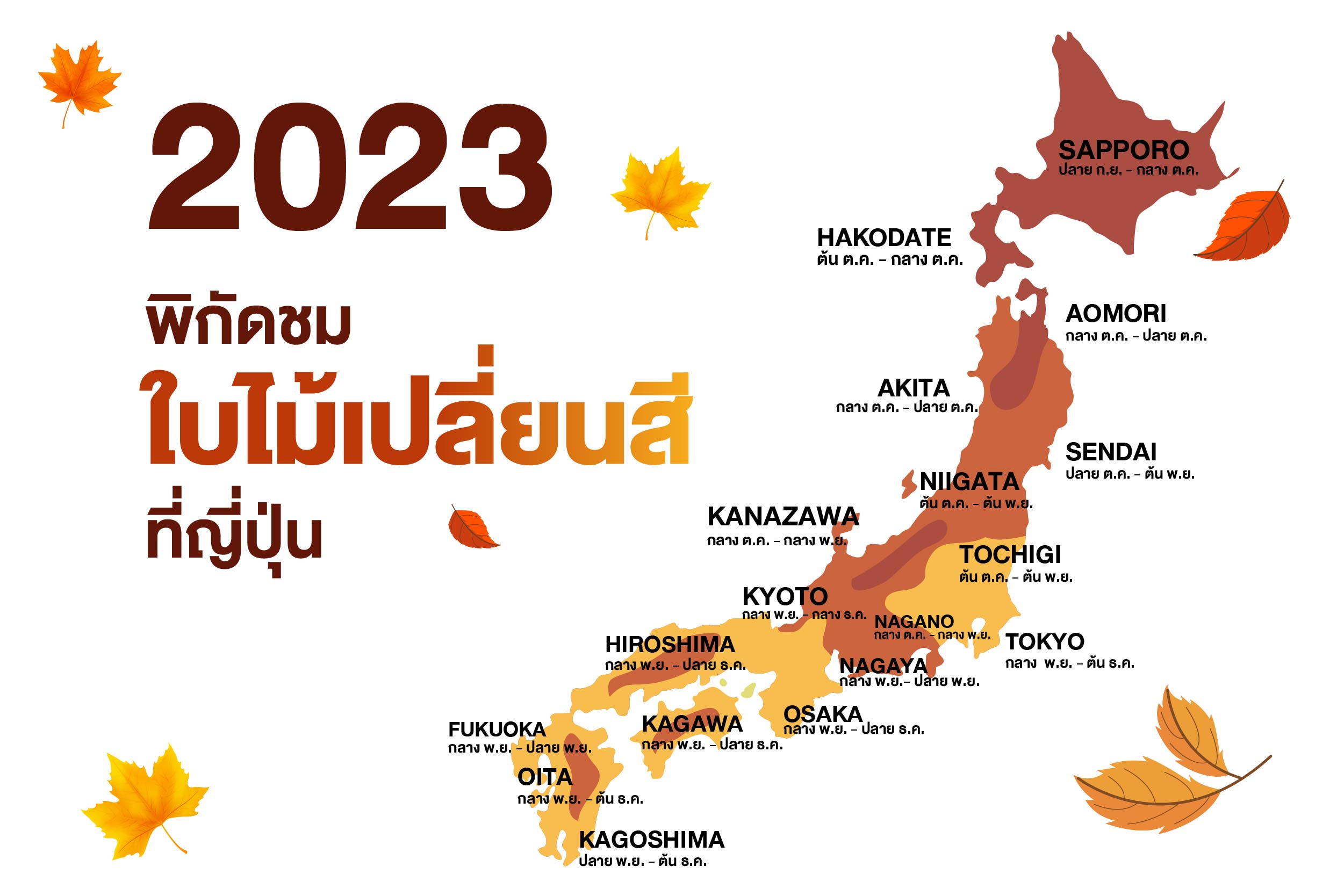 อย่างไรก็ตามมีการคาดการณ์ของปี 2023 มาแล้ว มาเริ่มไล่ดูกันเลยว่าเทศกาลใบไม้เปลี่ยนสีที่เกิดขึ้นในพื้นที่ต่างๆของประเทศญี่ปุ่นนั้น มีช่วงเวลาใดบ้างที่คุณมีโอกาสจะได้เห็นในปี 2023 นี้