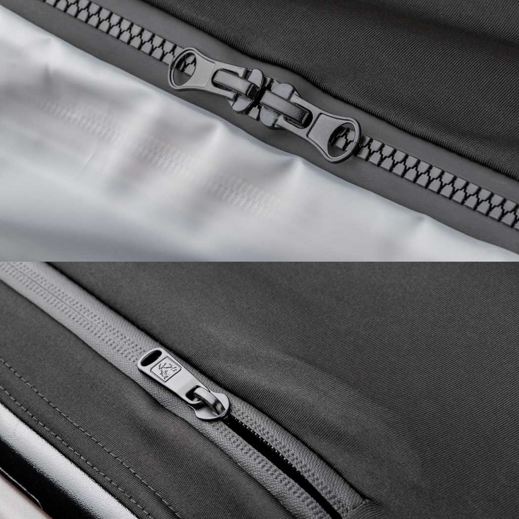 ซิปกันน้ำ: ช่องเปิดด้านหน้าซิปเทปผ้ากันน้ำ ส่วนซิปหูหิ้วเป็นแบบกันน้ำซึม ป้องกันน้ำเข้าสู่ภายใน