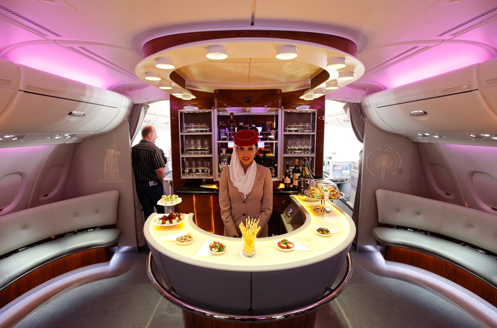 สายการบินของประเทศสหรัฐอาหรับเอมิเรตส์ ด้วยความกว้างขวาง โอ่อ่า หรูหรา ของที่นั่งเฟิร์สคลาสนี้ ทำให้เป็นที่ประทับใจของเหล่านักเดินทางระดับไฮคลาสทั้งหลาย จนพูดได้ว่าเป็นสวรรค์บนฟ้า ของที่นั่งชั้นเฟิร์สคลาสจากสายการบินเลยก็ว่าได้ ที่นั่งชั้นเฟิร์สคลาสของสายการบิน Emirates Airlines นี้ ได้ถูกจัดแบ่งเป็นห้องสูท ที่ให้ความเป็นส่วนตัว แก่ผู้โดยสาร มีจอทีวีกว้าง 21 นิ้วหน้าที่นั่งเป็นแบบ Touch Screen มีช่องรายการทีวีช่องต่างๆ ช่วยสร้าง ความบันเทิง ไม่ว่าจะดูหนัง ฟังเพลง เล่นเกม ดูการ์ตูน หรือชมสารคดี ฯลฯ แถมมีช่องรายการทีวีมากมายกว่า 1,000 ช่องให้เลือกรับชมได้ตลอดการเดินทาง เพียบพร้อมไปด้วยสารพัดอุปกรณ์อำนวยความสะดวก เพื่อความบันเทิงอย่างครบครัน พร้อมเสิร์ฟเมนูสุดหรูที่ปรุงแต่งจากเชฟฝีมือดี ซึ่งคุณสามารถเลือกสั่งทานได้ ตามใจชอบ กับหลากลายเมนูชั้นเลิศ ไม่ว่าจะเป็น ไข่ปลาคาเวียร์ชั้นดี หรือบรั่นดีรสเลิศ ซึ่งผู้โดยสาร ในชั้นเฟิร์สคลาสสามารถสั่งอาหารทานได้จนกว่าจะพอใจ ก่อนเครื่องลงจอด 45 นาที ด้วยความสะดวกสบาย ครบครันราวกับเป็นสวรรค์ชั้นเฟิร์สคลาสนี้เองทำให้ สายการบิน Emirates Airlines ได้รับรางวัล Best of In-Flight Entertainment มาแล้ว 3 ปีติดต่อกันเลยทีเดียว