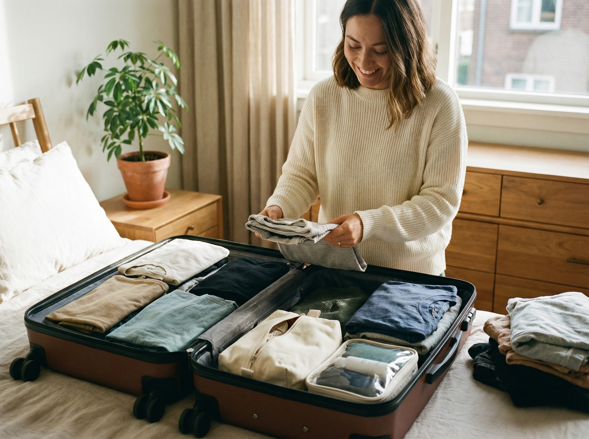 การจัดแบบนี้ช่วยให้กระเป๋าเดินทางไม่บวม ปิดง่าย และน้ำหนักกระจายสมดุล
