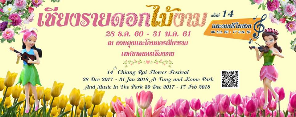 เทศกาลเชียงรายดอกไม้งาม ครั้งที่ 14 จัดขึ้นตั้งแต่วันนี้ – 31 ม.ค. 61 จะมีการจัดแสดงดอกไม้เมืองหนาวนานาพันธุ์ อาทิ ลิลลี่, กุหลาบ, เบญจมาศ, ดอกนาร์ซิสซัส และไฮไลท์เด่นที่สุด คือ ดอกทิวลิปหลากสีสันจำนวนมากที่หาชมได้ยากในบ้านเรา นอกจากนี้ยังมีกิจกรรมดนตรีในสวน จากศิลปินดาราชื่อดัง ที่จะมาขับกล่อมเสียงเพลงอันไพเราะเคล้าคลอไปกับมวลหมู่ดอกไม้แสนสวยงาม ฟังยาวๆ ไปจนถึง 17 ก.พ. 61 ณ สวนตุงและโคม เทศบาลนครเชียงราย